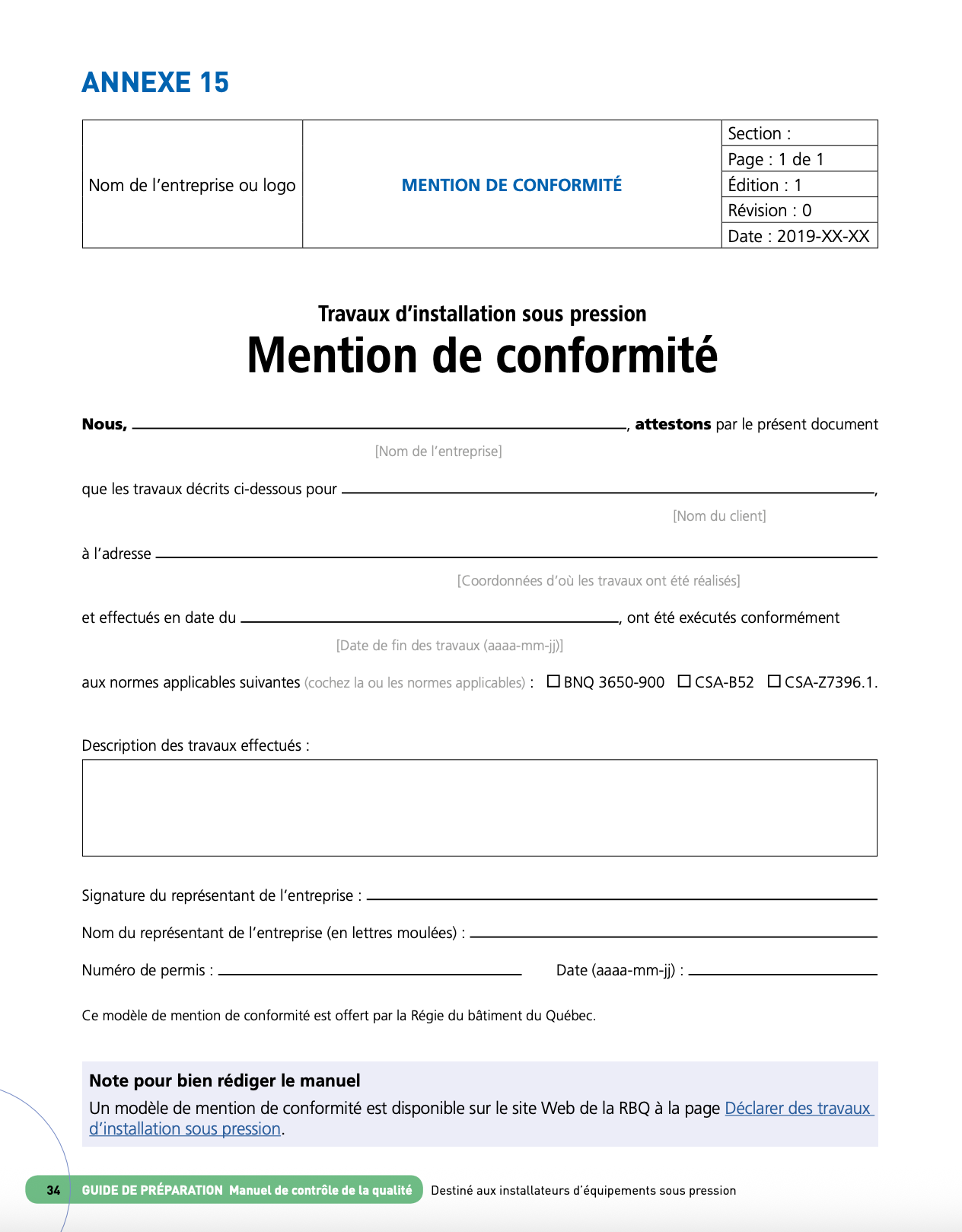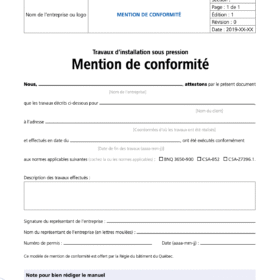 - Une entreprise titulaire d’un permis RBQ spécifique (installation ou modification d’équipement sous pression), OU